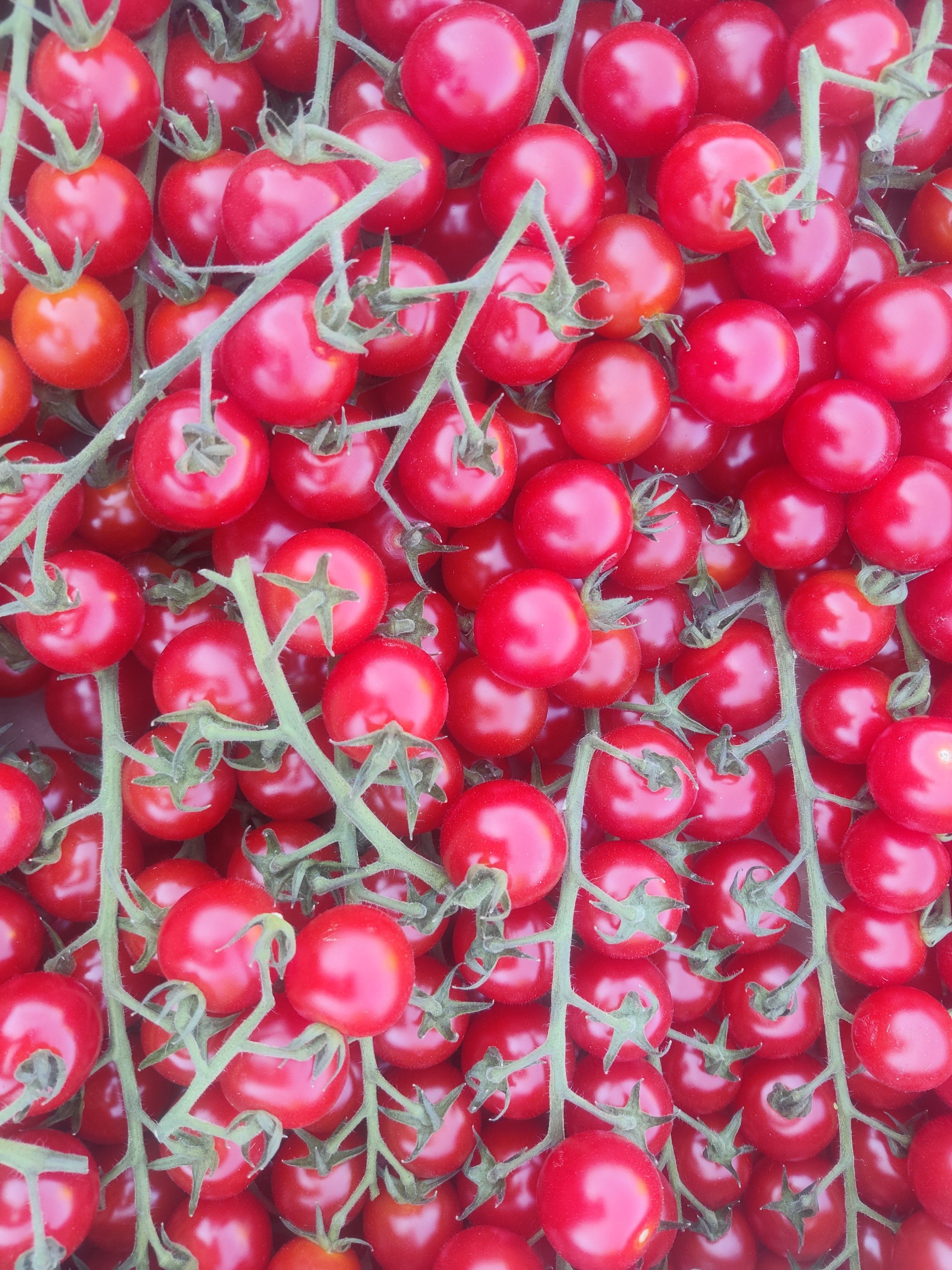 Start of the season Isle of Wight cherry vine tomatoes. These are delicious, super sweet, and a great addition to any meal or salad.
