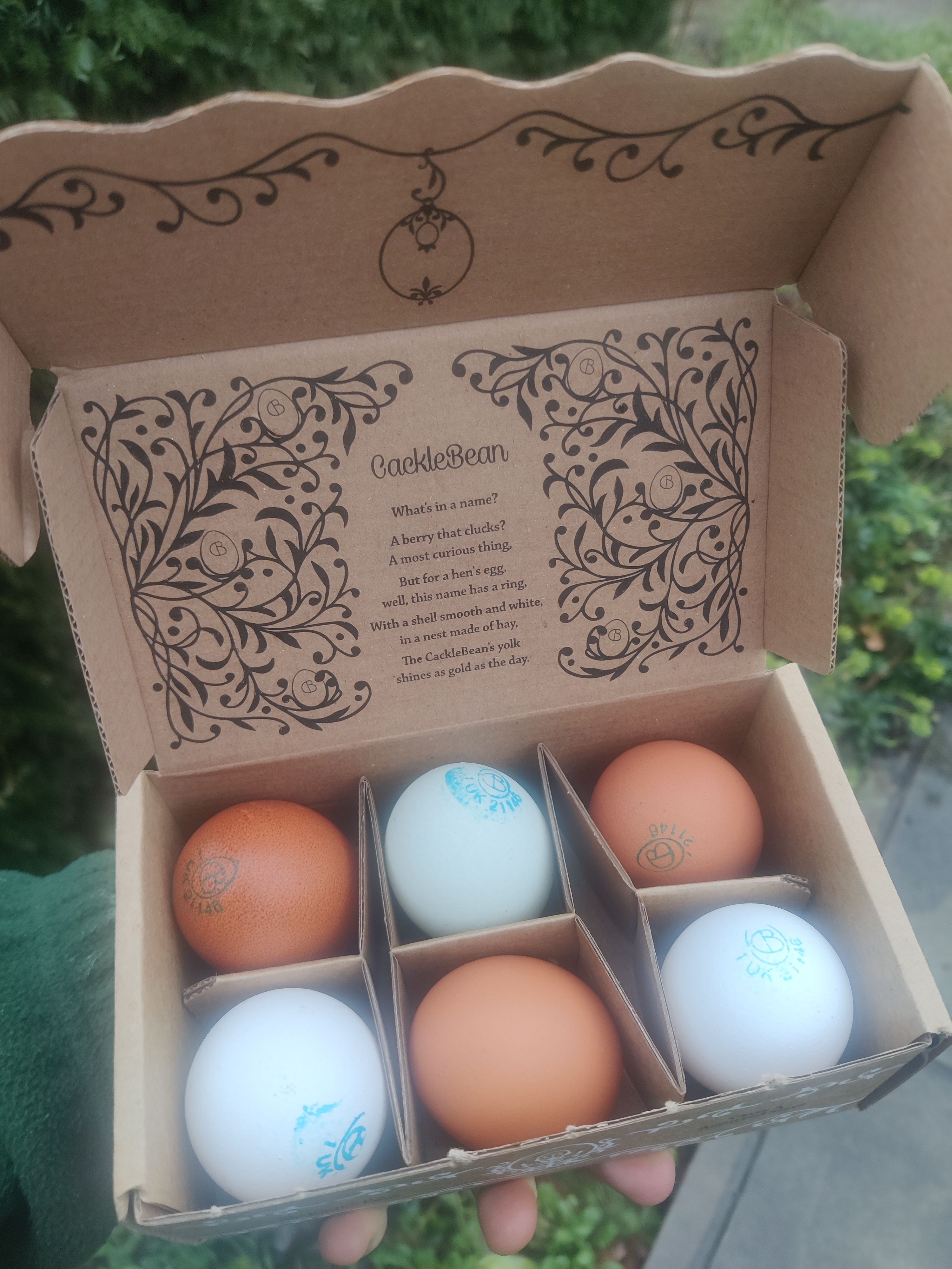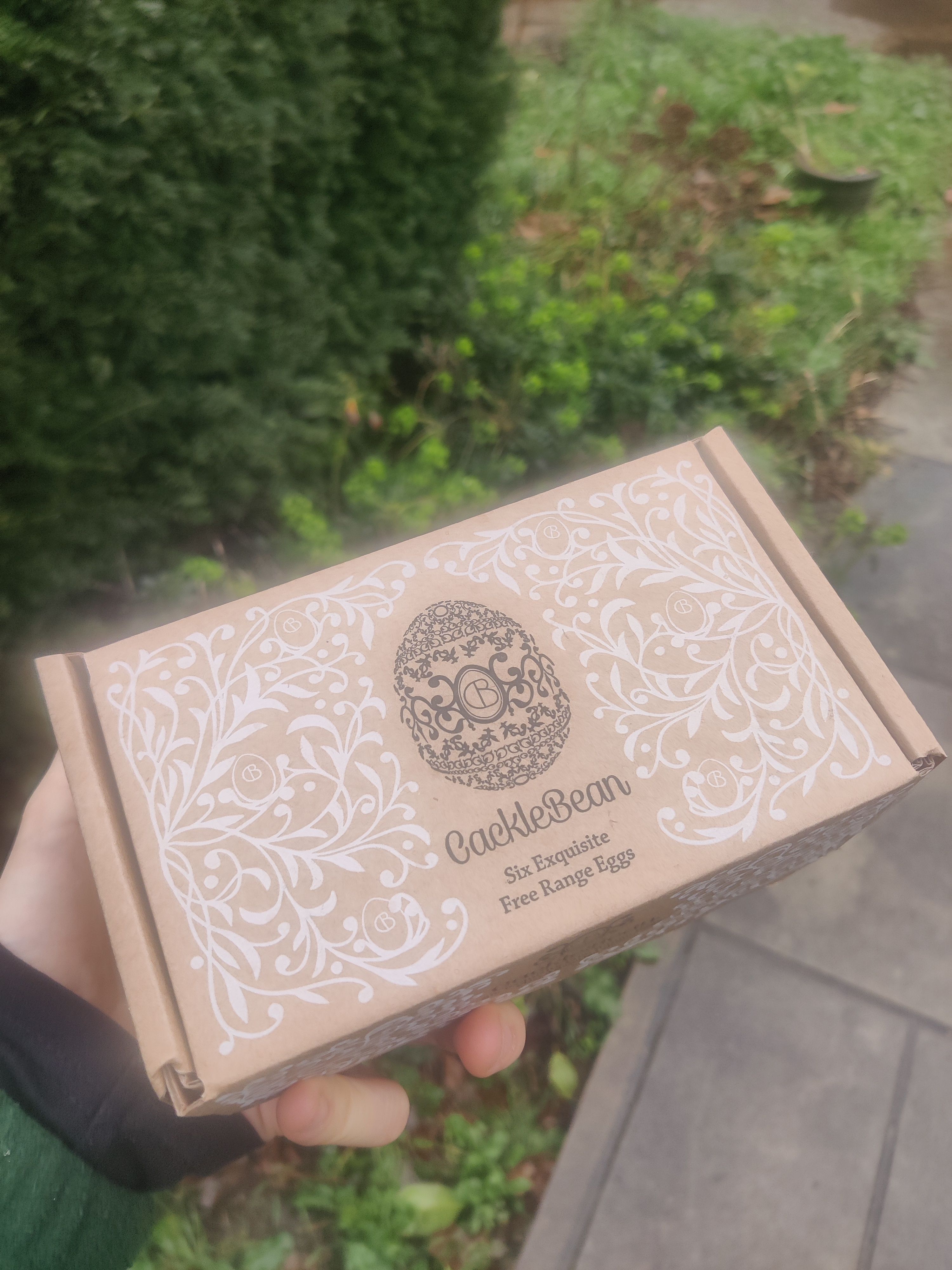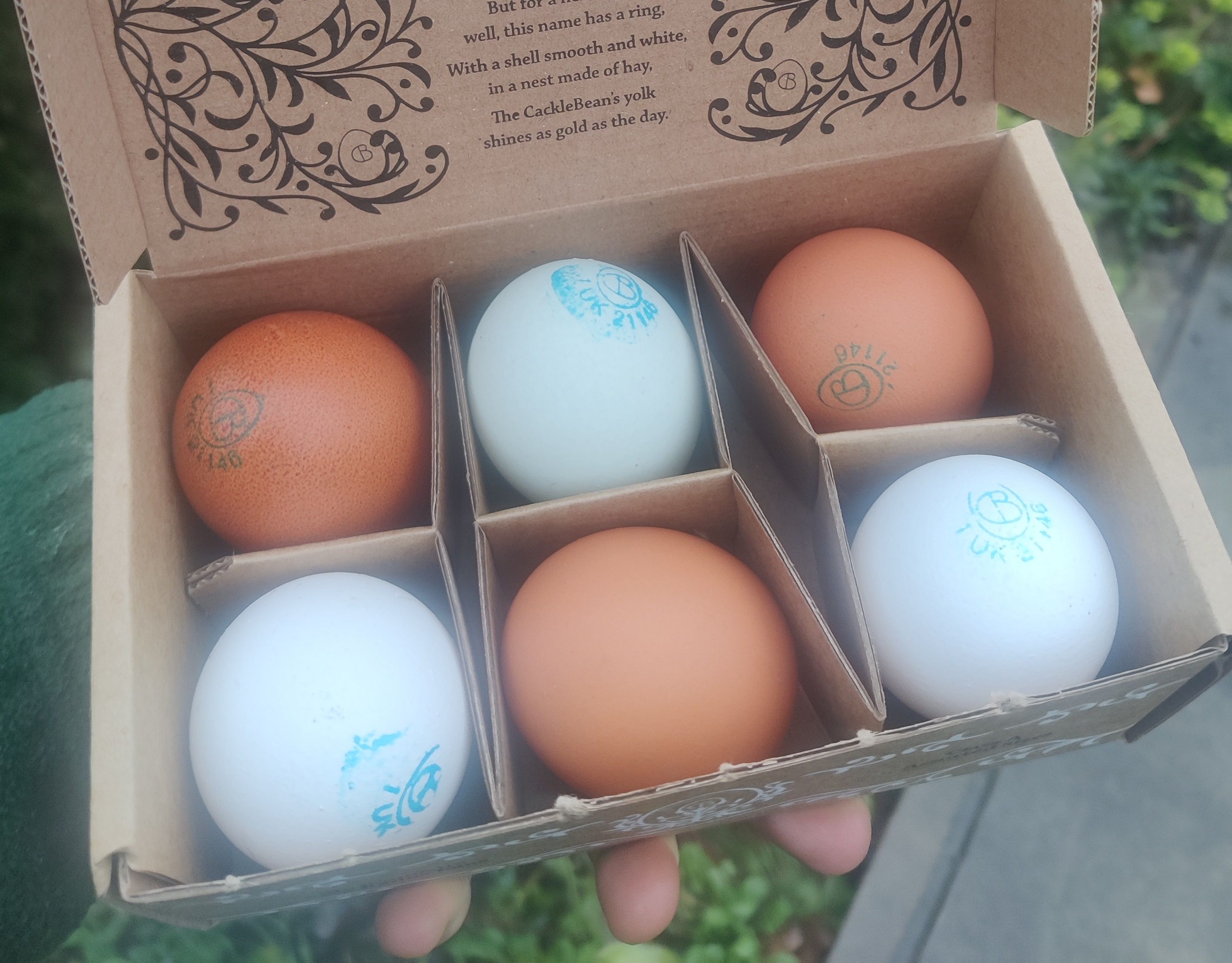 A box of six free range eggs from Cackle and Hen.